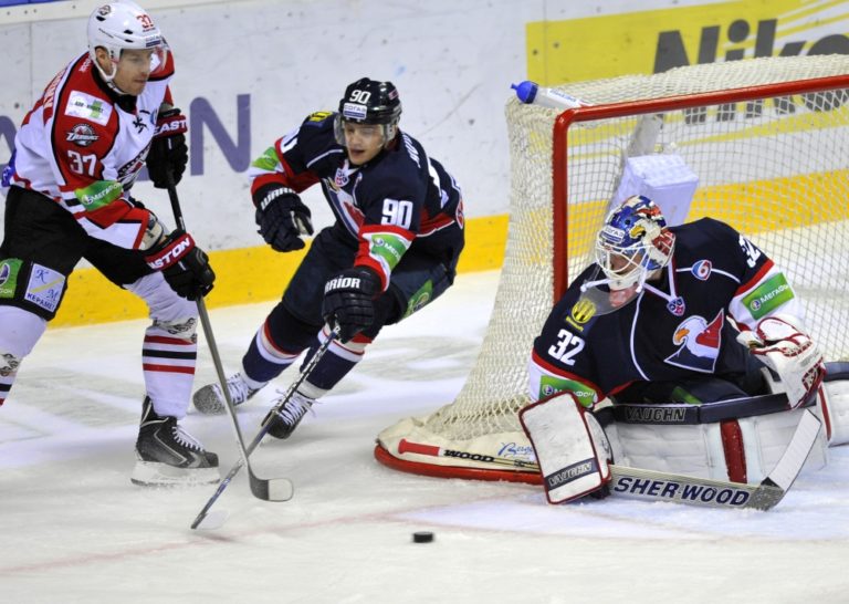 Sprava: Brankár Jaroslav Janus a Libor Hudáček zo Slovana a Peter Podhradský z Donecku počas zápasu Kontinentálnej hokejovej ligy (KHL) medzi HC Slovan Bratislava - Donbas Doneck. Bratislava, 28. február 2014. Foto: SITA/Ján Slovák