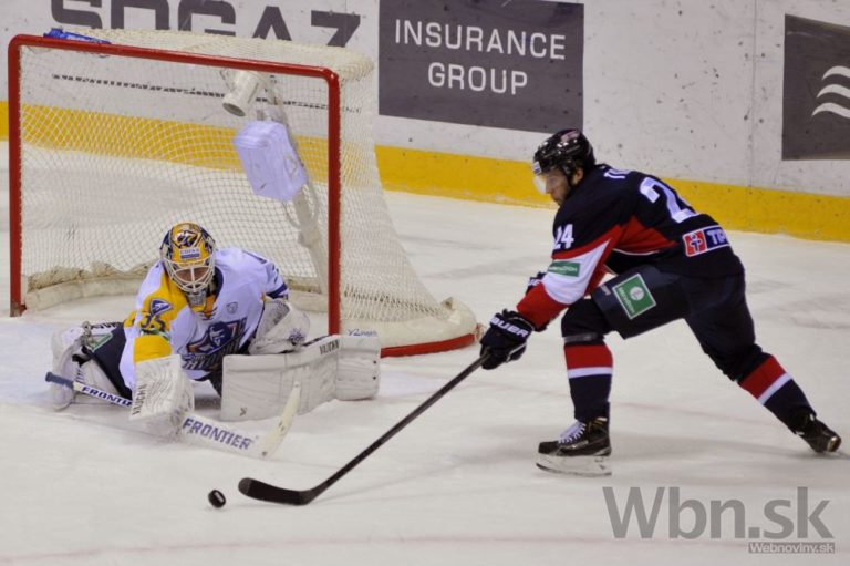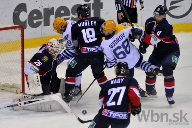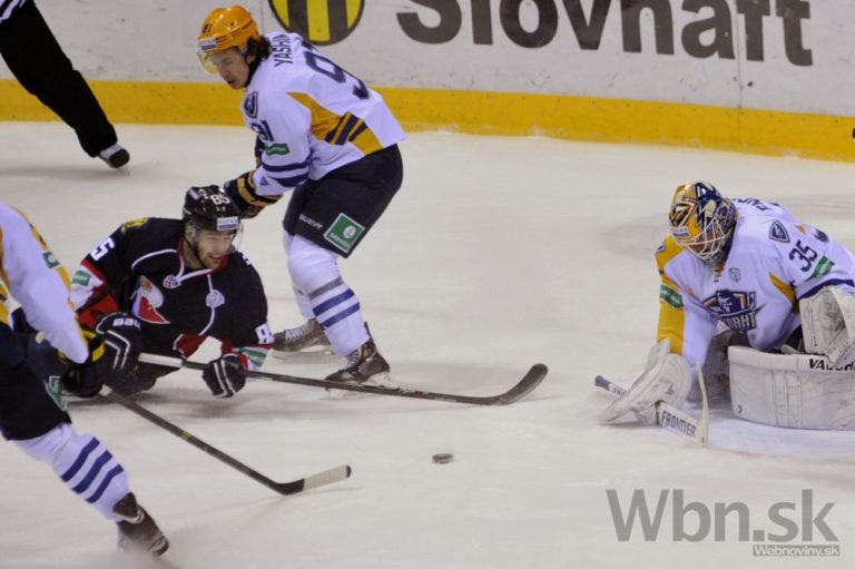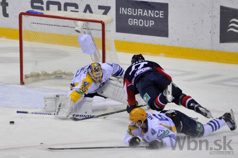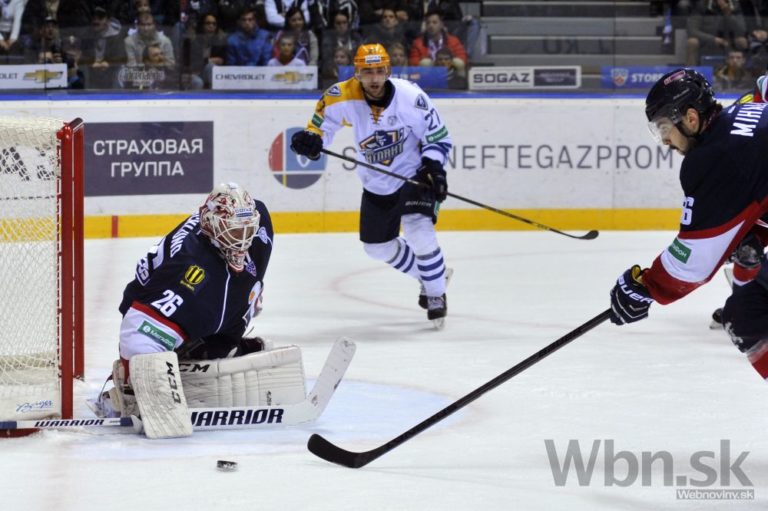 Obranca Atlantu Mytišiči Matthew Gilroy bezmocne sleduje ako útočník Slovana Bratislava Rok Tičar prekonáva brankára Atteho Engrena počas zápasu Kontinentálnej hokejovej ligy. Bratislava, 29. november 2014. Foto: SITA/Ján Slovák