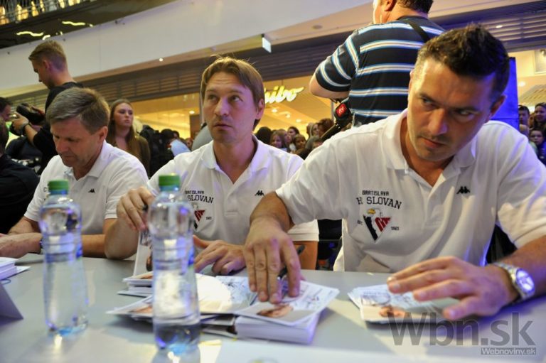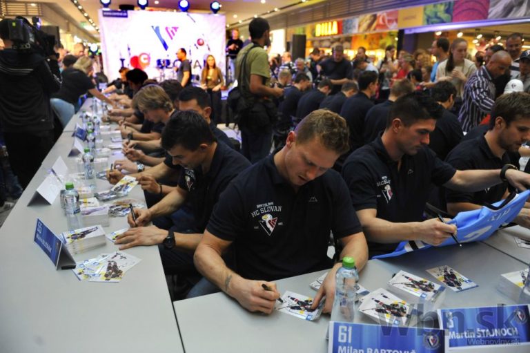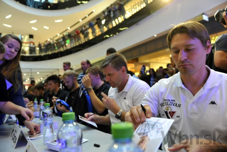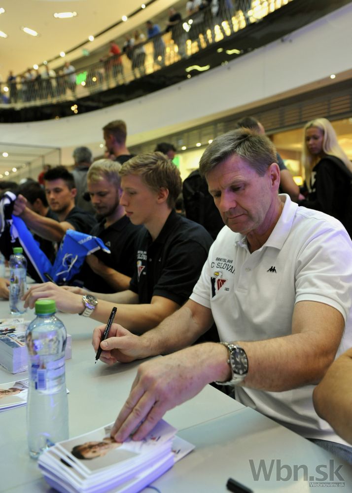 Hráči HC Slovan Bratislava počas autogramiády pred novou sezónou Kontinentálnej hokejovej ligy.2014/15. Bratislava, 1. september 2014. Foto: SITA/Ján Slovák