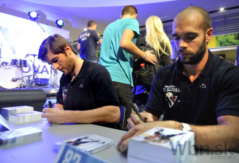 Hráči HC Slovan Bratislava Peter Ölvecký (vpravo chrbtom) a Václav Nedorost (vľavo chrbtom) počas autogramiády a predstavenia hráčov pred novou sezónou Kontinentálnej hokejovej ligy 2014/15. Bratislava, 1. september 2014. Foto: SITA/Ján Slovák