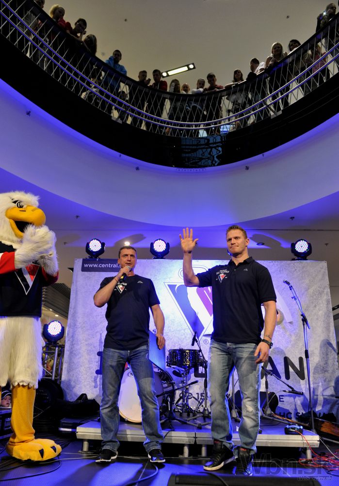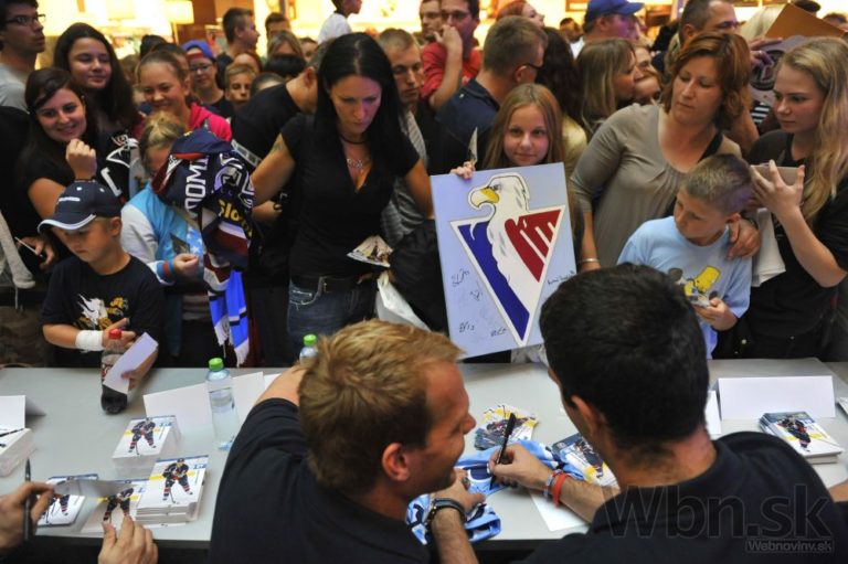 Kapitán HC Slovan Bratislava Milan Bartovič (vpravo) počas autogramiády a predstavenia hráčov pred novou sezónou Kontinentálnej hokejovej ligy 2014/15. Bratislava, 1. september 2014. Foto: SITA/Ján Slovák
