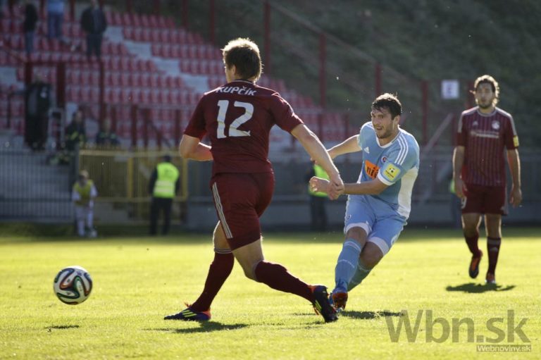 Ľuboš Kupčík (vpravo) z ŽP Šport Podbrezová počas zápasu 12. kola futbalovej Fortuna ligy medzi ŽP Šport Podbrezová – ŠK Slovan Bratislava. Podbrezová, 28. september 2014. Foto: SITA/Ján Viazanička