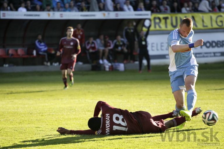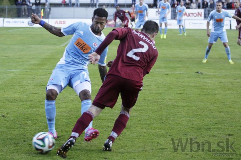 Milan Harvilko (vpravo) z ŽP Šport Podbrezová a Lester Stefan Peltier (vľavo) z ŠK Slovan Bratislava počas zápasu 12. kola futbalovej Fortuna ligy medzi ŽP Šport Podbrezová – ŠK Slovan Bratislava. Podbrezová, 28. september 2014. Foto: SITA/Ján Viazanička