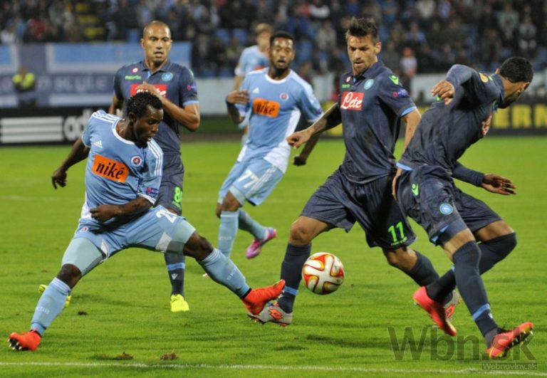 Futbalista SSC Neapol David López (vzadu) sleduje súboj svojho spoluhráča Kalidoua Koulibalyho so Seydoubom Soumahom zo Slovana Bratislava počas zápasu skupinovej fázy 2. kola I. skupiny Európskej ligy. Bratislava, 2. október 2014. Foto: SITA/Ján Slovák