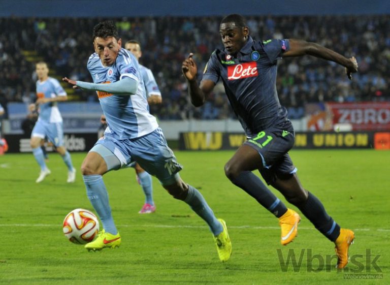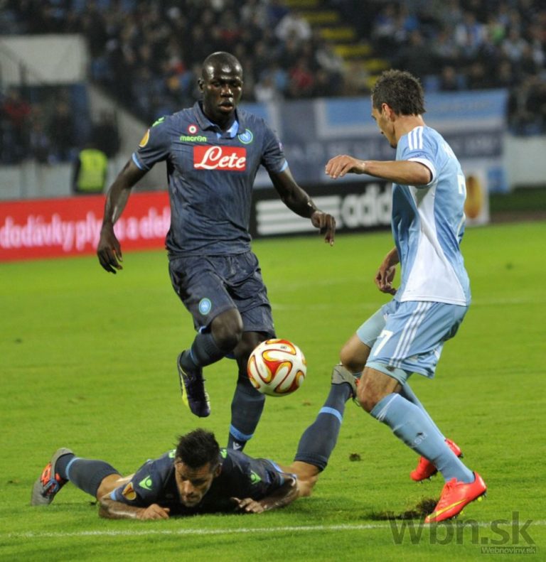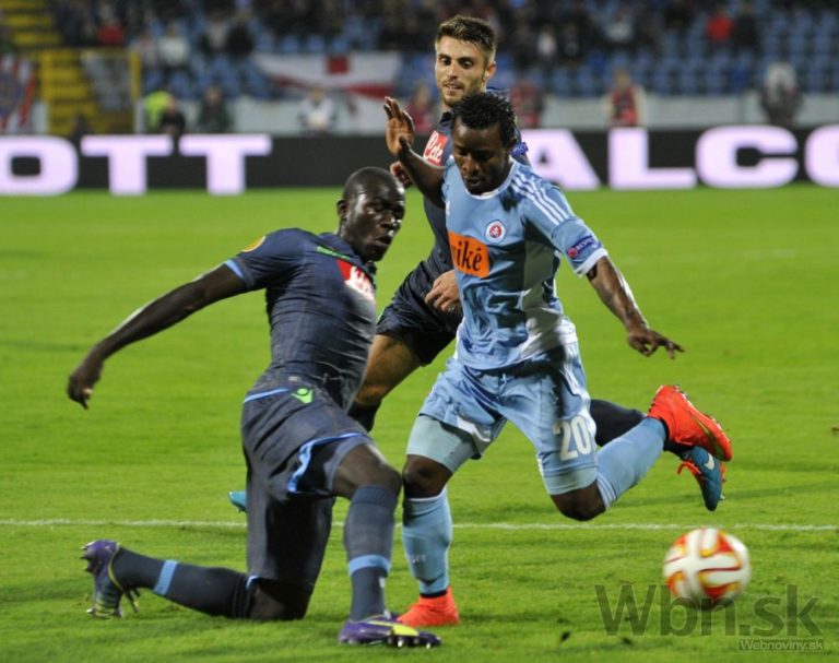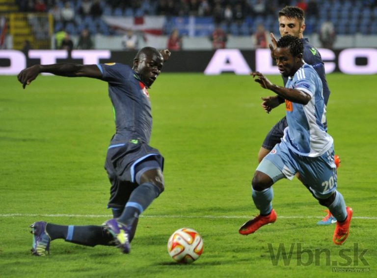Futbalista SSC Neapol Kalidou Koulibaly sleduje súboj svojho spoluhráča Christiana Maggia s Františkom Kubíkom zo Slovana Bratislava počas zápasu skupinovej fázy 2. kola I. skupiny Európskej ligy. Bratislava, 2. október 2014. Foto: SITA/Ján Slovák