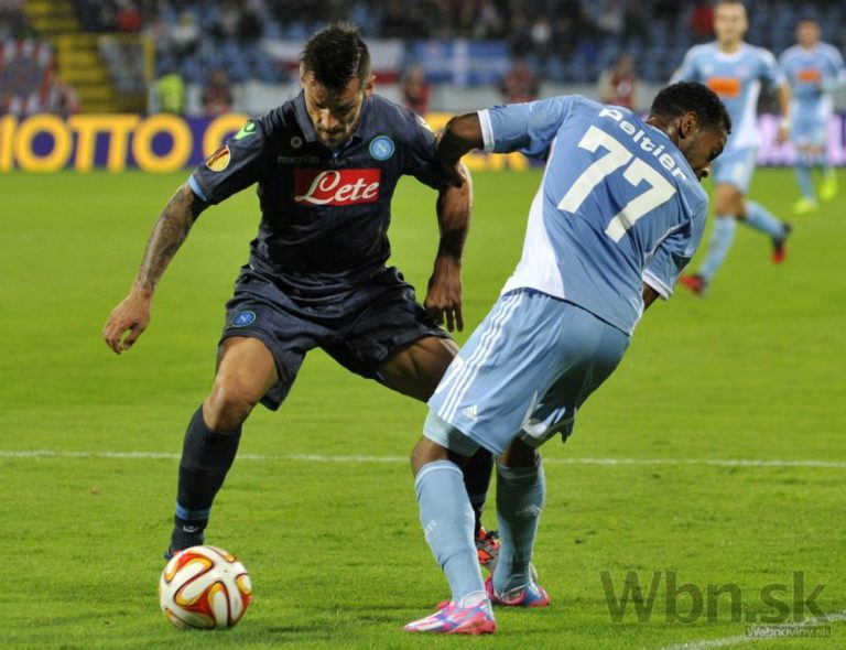 Obranca SSC Neapol Christian Maggio (vľavo) v súboji o loptu s Františkom Kubíkom zo Slovana Bratislava počas zápasu skupinovej fázy 2. kola I. skupiny Európskej ligy. Bratislava, 2. október 2014. Foto: SITA/Ján Slovák