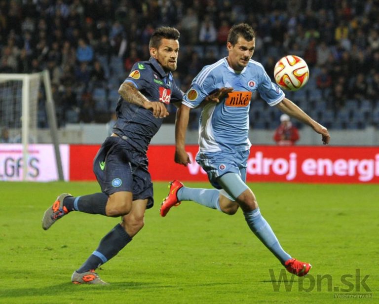 Erik Čikoš (vľavo) zo Slovana Bratislava sleduje kapitána SSC Neapol Mareka Hamšíka počas zápasu skupinovej fázy 2. kola I. skupiny Európskej ligy. Bratislava, 2. október 2014. Foto: SITA/Ján Slovák