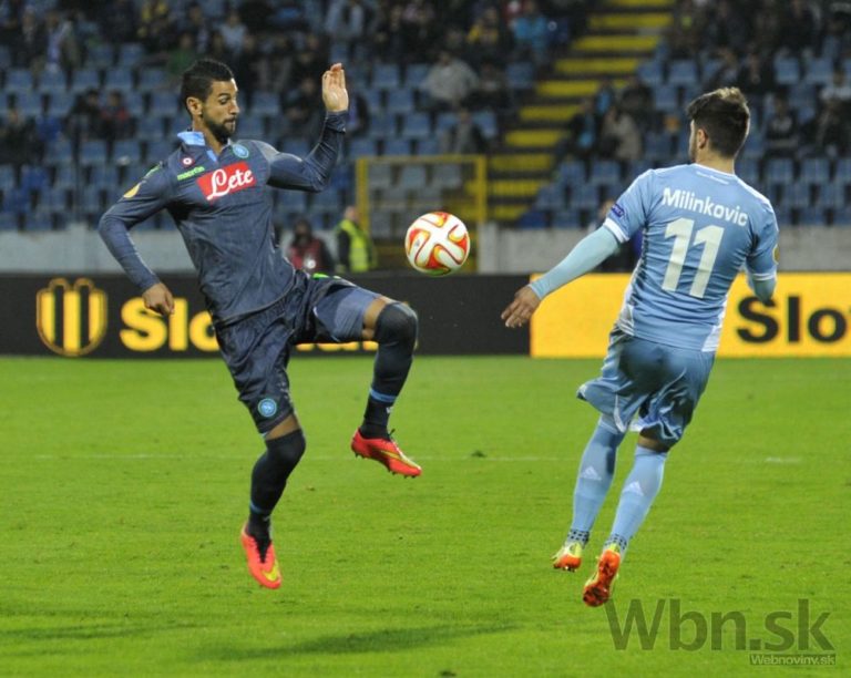 Futbalista SSC Neapol Miguel Britos v súboji s hráčom Slovana Bratislava Markom Milinkovičom počas zápasu skupinovej fázy 2. kola I. skupiny Európskej ligy. Bratislava, 2. október 2014. Foto: SITA/Ján Slovák