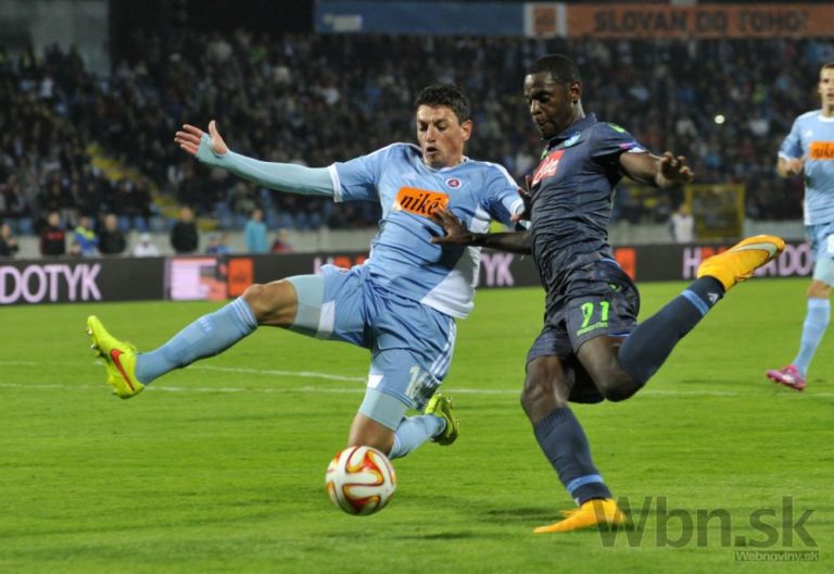 Nicolas Gorosito (vľavo) zo Slovana Bratislava v súboji o loptu s hráčom SSC Neapol Duválom Zapatom počas zápasu skupinovej fázy 2. kola I. skupiny Európskej ligy. Bratislava, 2. október 2014. Foto: SITA/Ján Slovák