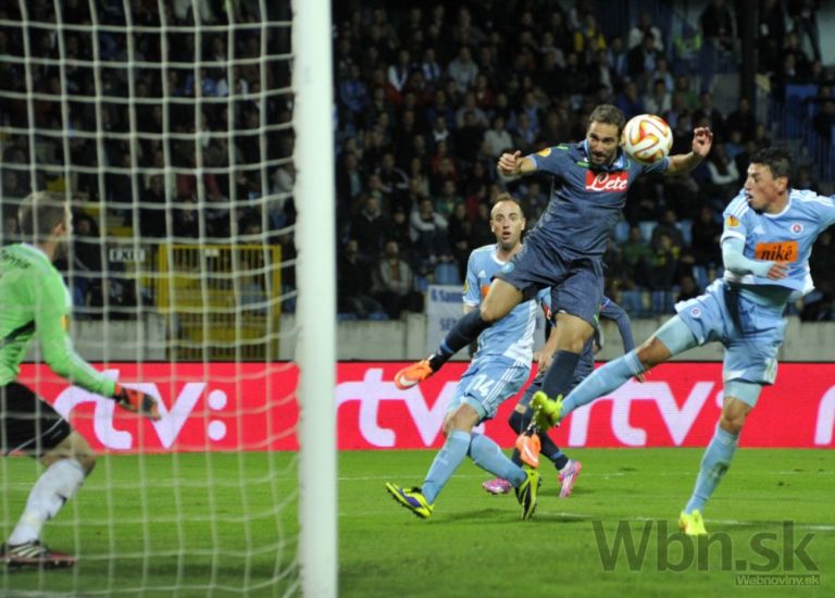 Futbalisti Slovana Bratislava Nicolas Gorosito a Tomáš Jablonský sa bezmocne pozerajú ako útočník SSC Neapol Gonzalo Higuaín prekonáva brankára Dušana Perniša počas zápasu skupinovej fázy 2. kola I. skupiny Európskej ligy. Bratislava, 2. október 2014. Foto: SITA/Ján Slovák