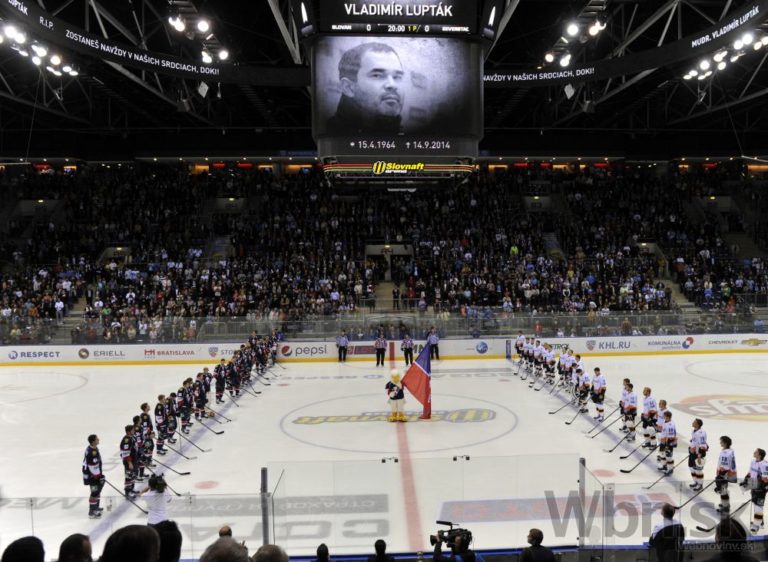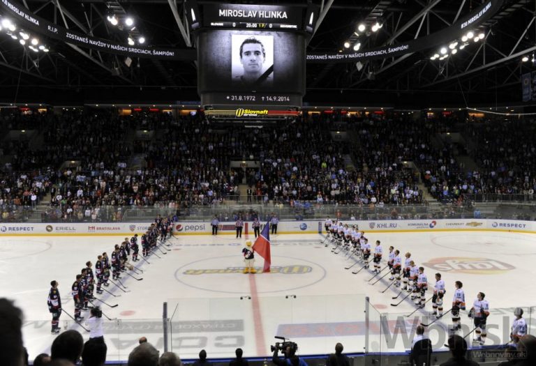 Minúta ticha za zosnulého bývalého slovenského hokejového reprezentanta a majstra sveta 2002 Miroslava Hlinku pred začiatkom zápasu Kontinentálnej hokejovej ligy (KHL) medzi HC Slovan Bratislava - Severstaľ Čerepovec. Bratislava, 16. september 2014. Foto: SITA/Ján Slovák