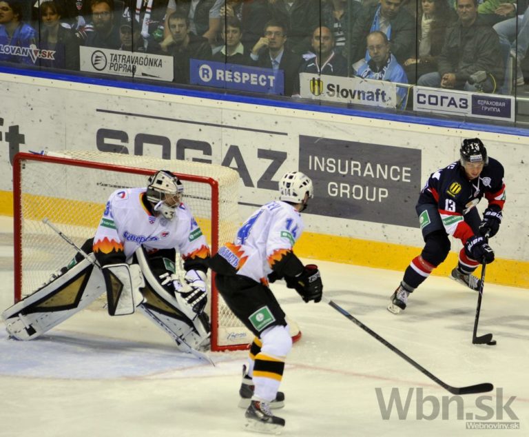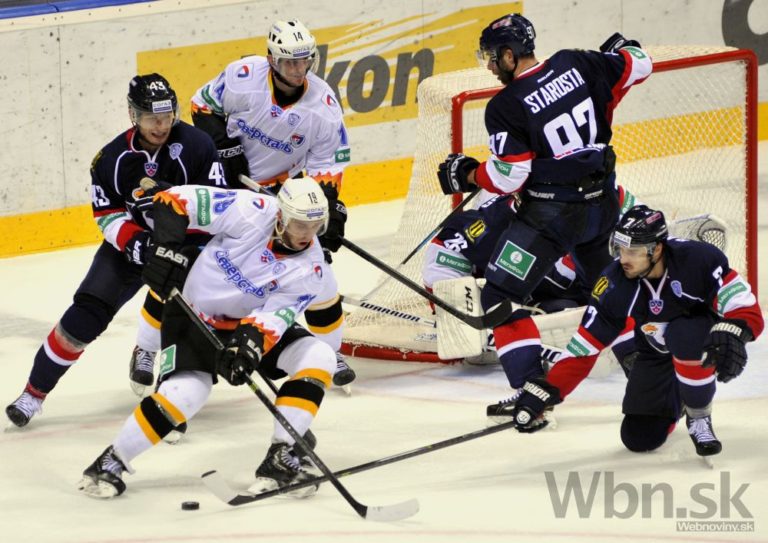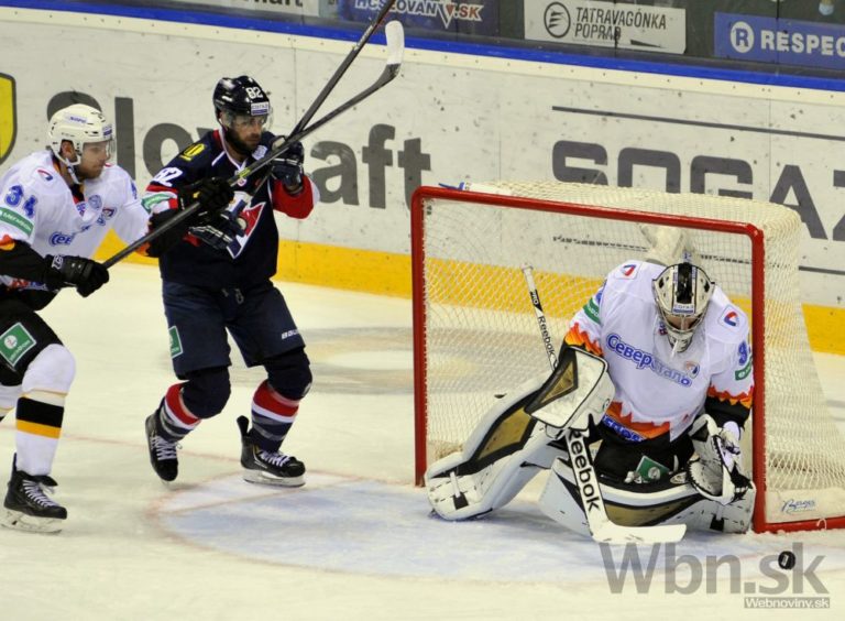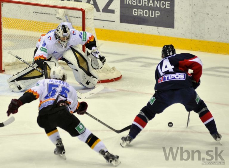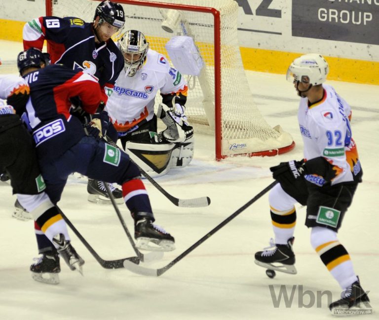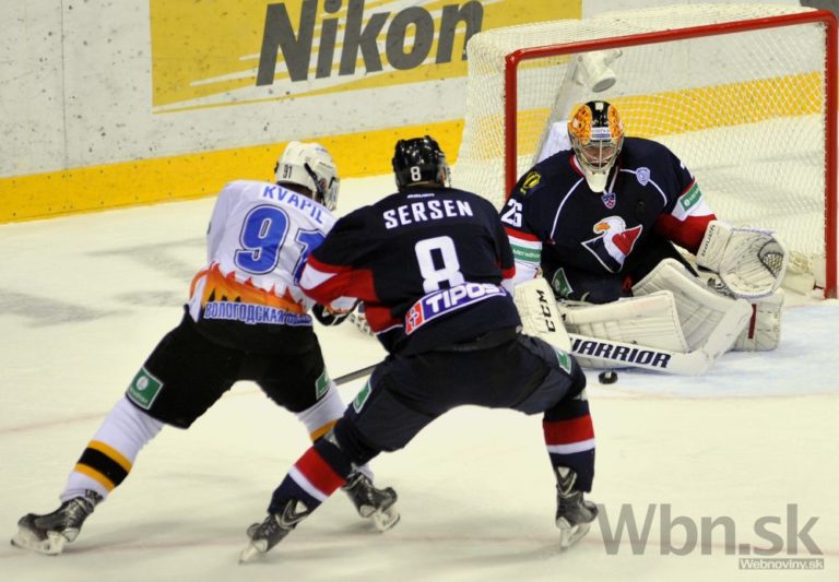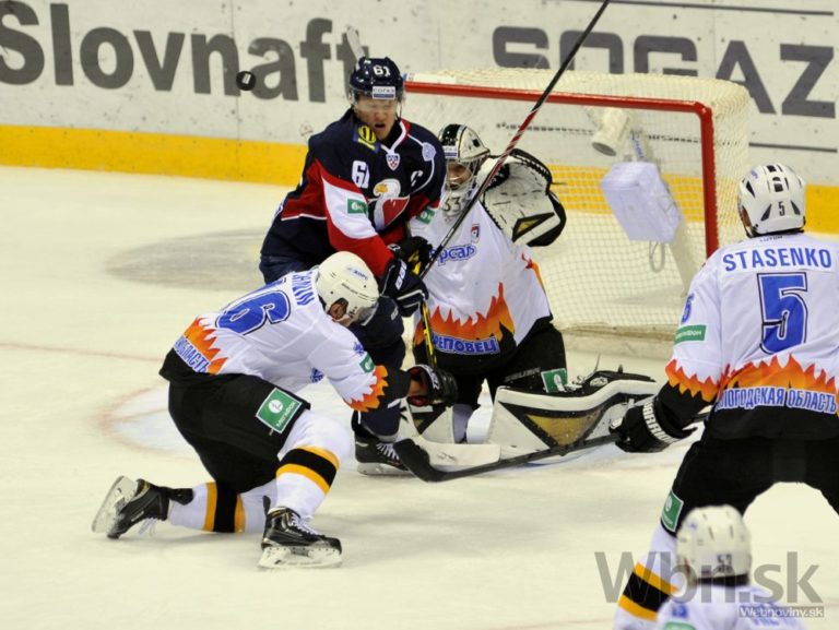 Útočník Slovana Bratislava Václav Nedorost sleduje ako sa obranca Severstaľu Čerepovec snaží odpáliť puk spred brankára Jakuba Štěpánka pred MIchalom Vondrkom počas zápasu Kontinentálnej hokejovej ligy. Bratislava 16. septembra 2014. Foto: SITA/Ján Slovák