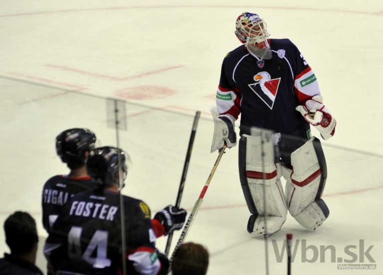 Útočník Slovana Bratislava Michal Vondrka a Alexander Urbom zo Severstaľu Čerepovec sa pozerajú na zákrok brankára Jakuba Štěpánka počas zápasu Kontinentálnej hokejovej ligy. Bratislava 16. septembra 2014. Foto: SITA/Ján Slovák