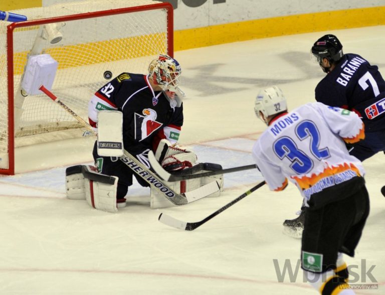 Obranca Slovana Bratislava Ivan Baranka sa bezmocne pozerá ako puk z hokejky útočníka Severstaľu Čerepovec Jevgenija Monsa smeruje za chrbát brankára Jaroslava Janusa počas zápasu Kontinentálnej hokejovej ligy. Bratislava 16. septembra 2014. Foto: SITA/Ján Slovák