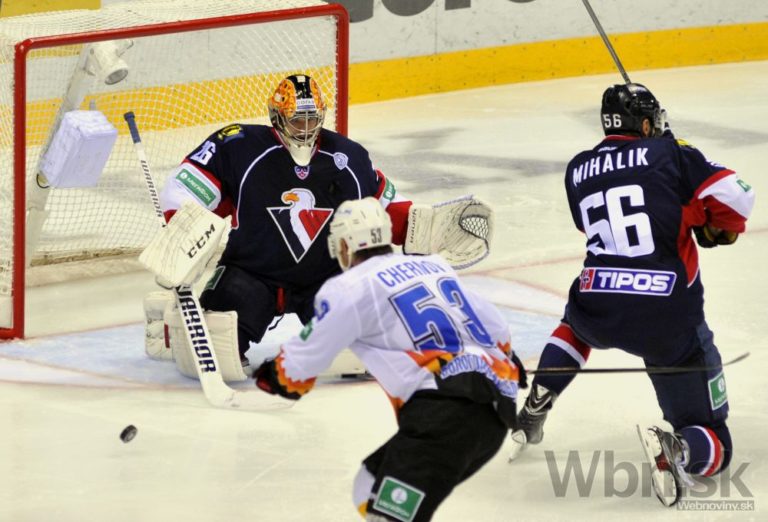 Obranca Slovana Bratislava Vladimír Mihálik v súboji s útočníkom Severstaľu Čerepovec Pavlom Černovom pred brankárom 'belasých' Johanom Backlundom počas zápasu Kontinentálnej hokejovej ligy. Bratislava, 16. september 2014. Foto: SITA/Ján Slovák