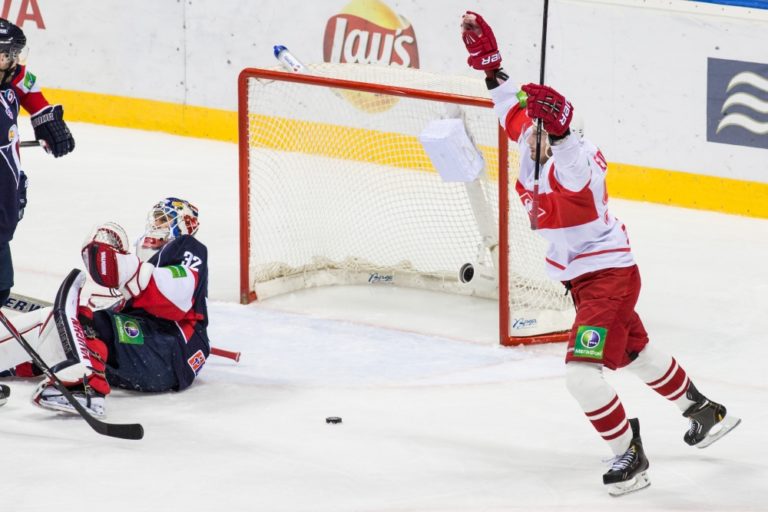 Hráči Spartaka sa tešia z gólu počas hokejového zápasu ligy KHL medzi HC Slovan Bratislava - Spartak Moskva. Bratislava, 2. marec 2014. Foto: SITA/Jozef Jakubčo