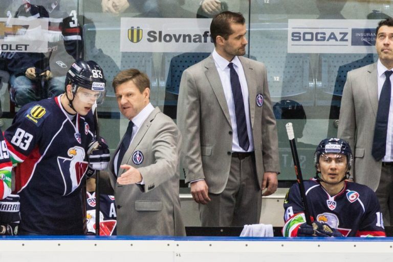 Tréner Slovana Rostislav Čada (druhý zľava) počas hokejového zápasu ligy KHL medzi HC Slovan Bratislava - Spartak Moskva. Bratislava, 2. marec 2014. Foto: SITA/Jozef Jakubčo