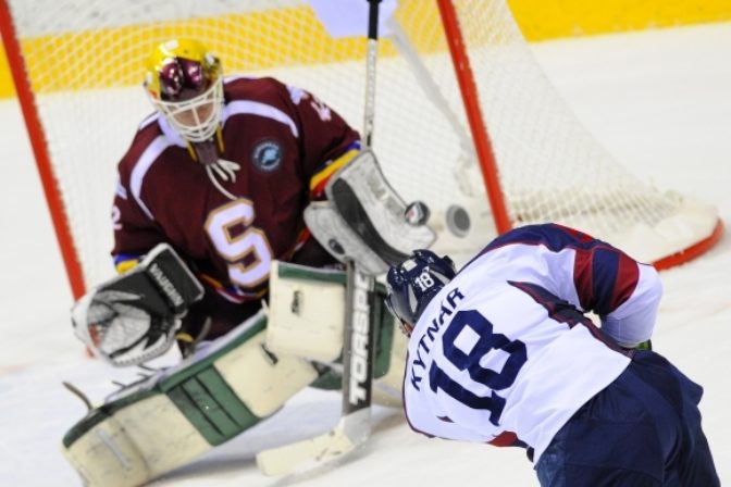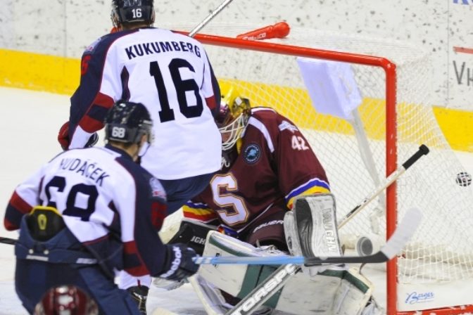 Brankár Slovana Jaroslav Janus (vpravo) počas zápasu hokejového turnaja European Trophy medzi HC Slovan Bratislava a Sparta Praha (ČR). Foto: SITA/Jozef Jakubčo