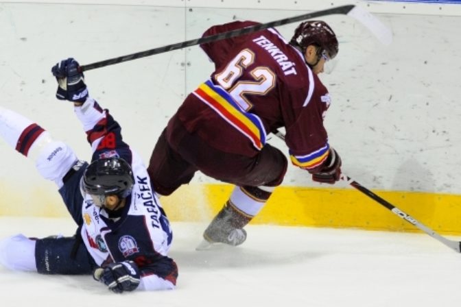Hráči Sparty Karel Kubát a Vladimír Sičák počas zápasu hokejového turnaja European Trophy medzi HC Slovan Bratislava a Sparta Praha (ČR). Foto: SITA/Jozef Jakubčo