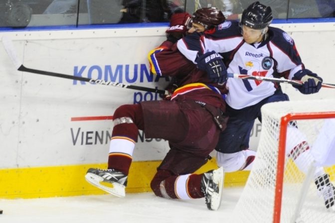 Hráči Slovana Michal Sersen a Martin Škoula počas zápasu hokejového turnaja European Trophy medzi HC Slovan Bratislava a Sparta Praha (ČR). Foto: SITA/Jozef Jakubčo