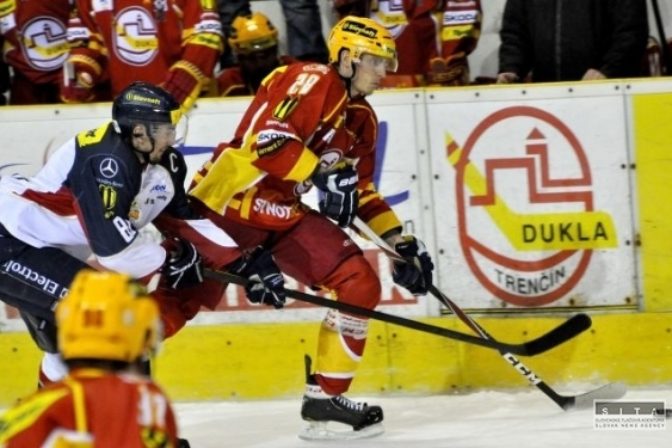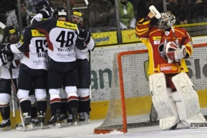 Radosť hráčov Trenčína po treťom góle v druhom zápase semifinále hokejovej Tipsport extraligy medzi HC Slovan Bratislava - Dukla Trenčín. Bratislava, 26. marec 2012. Foto: SITA/Marián Peiger
