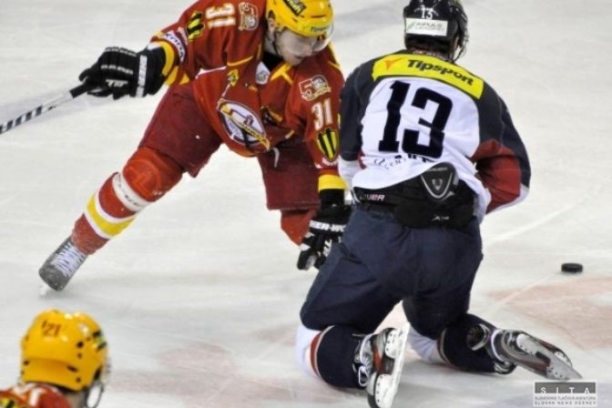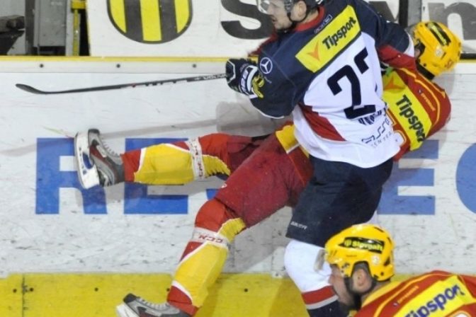 Zľava: Ivan Ďatelinka zo Slovana a Tomáš Jablonský z Trenčína v druhom zápase semifinále hokejovej Tipsport extraligy medzi HC Slovan Bratislava - Dukla Trenčín. Bratislava, 26. marec 2012. Foto: SITA/Marián Peiger