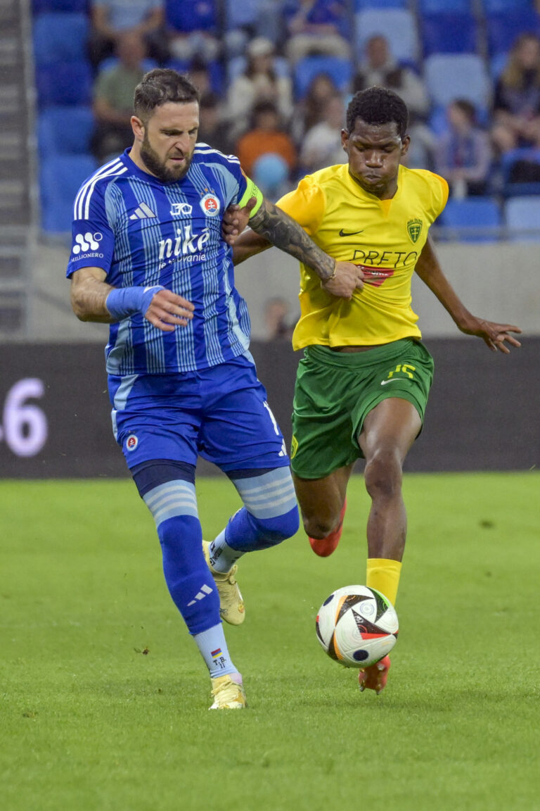 Zľava: Tigran Barsehjan z ŠK Slovan Bratislava a Adama Drame z MFK Žilina počas futbalového zápasu 8. kola nadstavbovej časti Niké ligy o titul 2024/25 medzi ŠK Slovan Bratislava - MŠK Žilina. Bratislava, 3. máj 2025. Foto: SITA/Milan Illík.