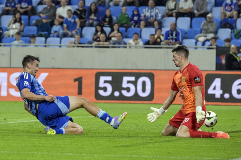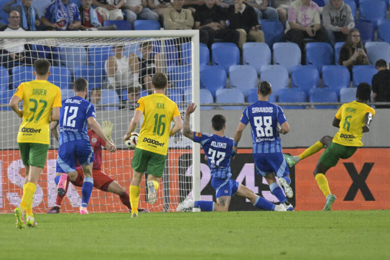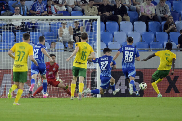 Adang Savier z MFK Žilina (vpravo) strieľa gol počas futbalového zápasu 8. kola nadstavbovej časti Niké ligy o titul 2024/25 medzi ŠK Slovan Bratislava - MŠK Žilina. Bratislava, 3. máj 2025. Foto: SITA/Milan Illík.