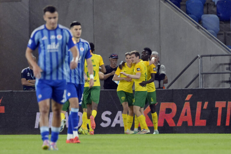 Hráči MFK Žilina sa tešia po strelenom góle počas futbalového zápasu 8. kola nadstavbovej časti Niké ligy o titul 2024/25 medzi ŠK Slovan Bratislava - MŠK Žilina. Bratislava, 3. máj 2025. Foto: SITA/Milan Illík.