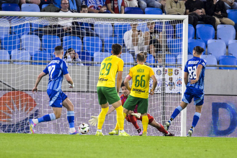 Miroslav Káčer z MFK Žilina (druhý sprava) strieľa gol počas futbalového zápasu 8. kola nadstavbovej časti Niké ligy o titul 2024/25 medzi ŠK Slovan Bratislava - MŠK Žilina. Bratislava, 3. máj 2025. Foto: SITA/Milan Illík.