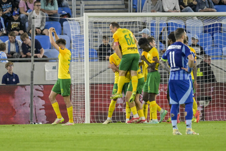 Hráči z MFK Žilina sa tešia po strelenom góle počas futbalového zápasu 8. kola nadstavbovej časti Niké ligy o titul 2024/25 medzi ŠK Slovan Bratislava - MŠK Žilina. Bratislava, 3. máj 2025. Foto: SITA/Milan Illík.