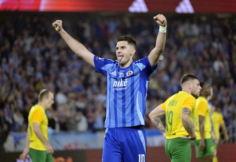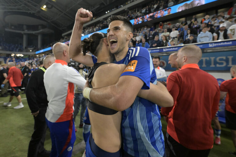 Marko Tolič z ŠK Slovan Bratislava sa teší po ukončení futbalového zápasu 8. kola nadstavbovej časti Niké ligy o titul 2024/25 medzi ŠK Slovan Bratislava - MŠK Žilina. Bratislava, 3. máj 2025. Foto: SITA/Milan Illík.