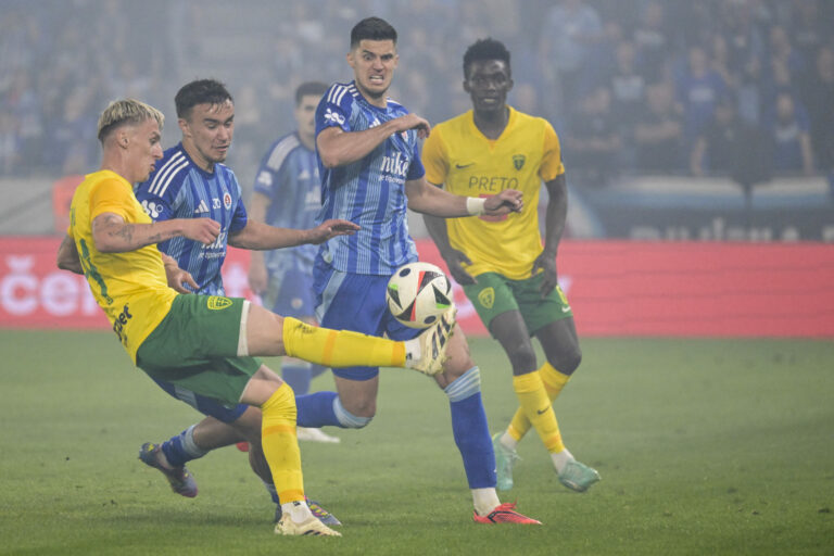 Zľava v popredí: Tigran Barsehjan a Róbert Mak, obaja z ŠK Slovan Bratislava počas futbalového zápasu 8. kola nadstavbovej časti Niké ligy o titul 2024/25 medzi ŠK Slovan Bratislava - MŠK Žilina. Bratislava, 3. máj 2025. Foto: SITA/Milan Illík.