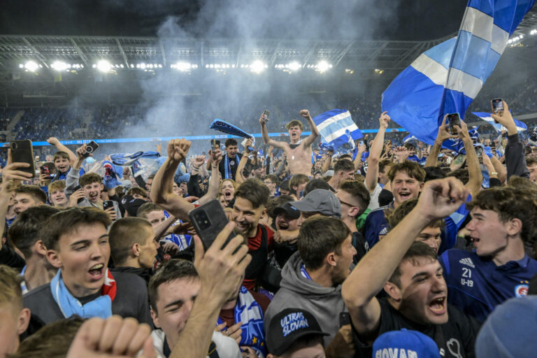 Matúš Vojtko z ŠK Slovan Bratislava (tretí sprava v popredí) oslavuje majstrovský titul s fanúšikmi a hráčmi ŠK Slovan Bratislava po ukončení futbalového zápasu 8. kola nadstavbovej časti Niké ligy o titul 2024/25 medzi ŠK Slovan Bratislava - MŠK Žilina. Bratislava, 3. máj 2025. Foto: SITA/Milan Illík.