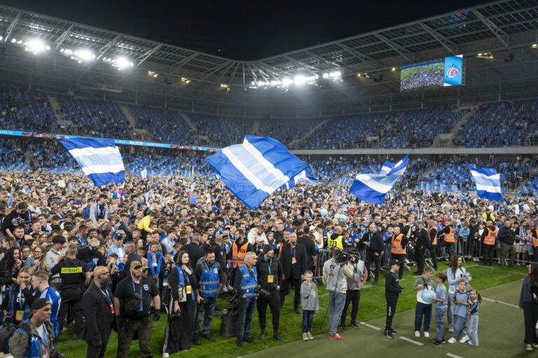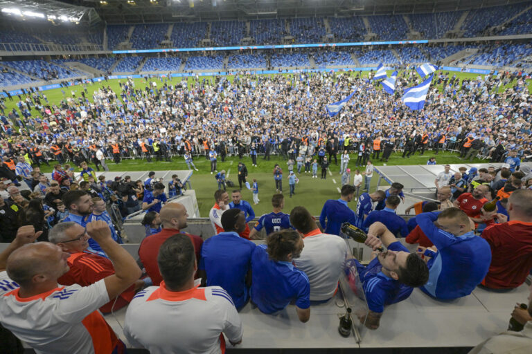 Fanúšikovia ŠK Slovan Bratislava oslavujú majstrovský titul s hráčmi po ukončení futbalového zápasu 8. kola nadstavbovej časti Niké ligy o titul 2024/25 medzi ŠK Slovan Bratislava - MŠK Žilina. Bratislava, 3. máj 2025. Foto: SITA/Milan Illík.