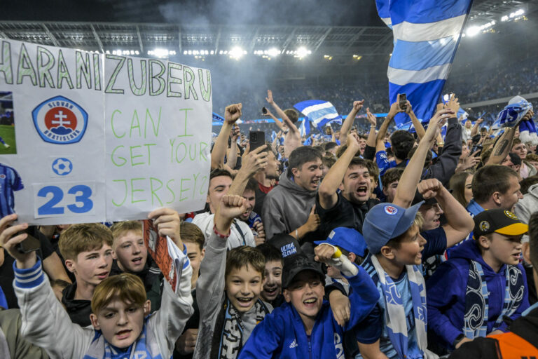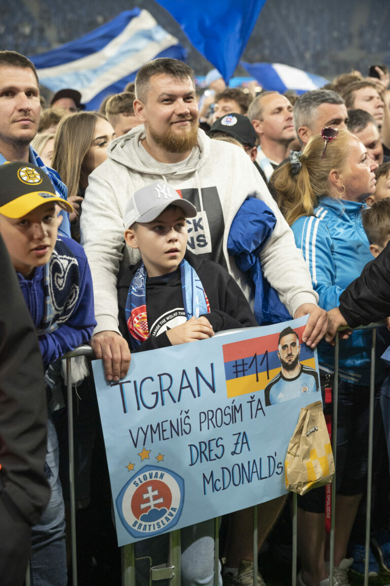 Zľava: Vladimír Weiss a Tigran Berseghjan, obaja z ŠK Slovan Bratislava sa vítajú s fanúšikmi po ukončení futbalového zápasu 8. kola nadstavbovej časti Niké ligy o titul 2024/25 medzi ŠK Slovan Bratislava - MŠK Žilina. Bratislava, 3. máj 2025. Foto: SITA/Milan Illík.
