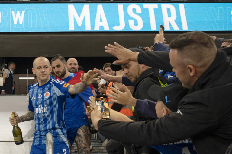Hráči ŠK Slovan Bratislava oslavujú titul s fanúšikmi po ukončení futbalového zápasu 8. kola nadstavbovej časti Niké ligy o titul 2024/25 medzi ŠK Slovan Bratislava - MŠK Žilina. Bratislava, 3. máj 2025. Foto: SITA/Milan Illík.
