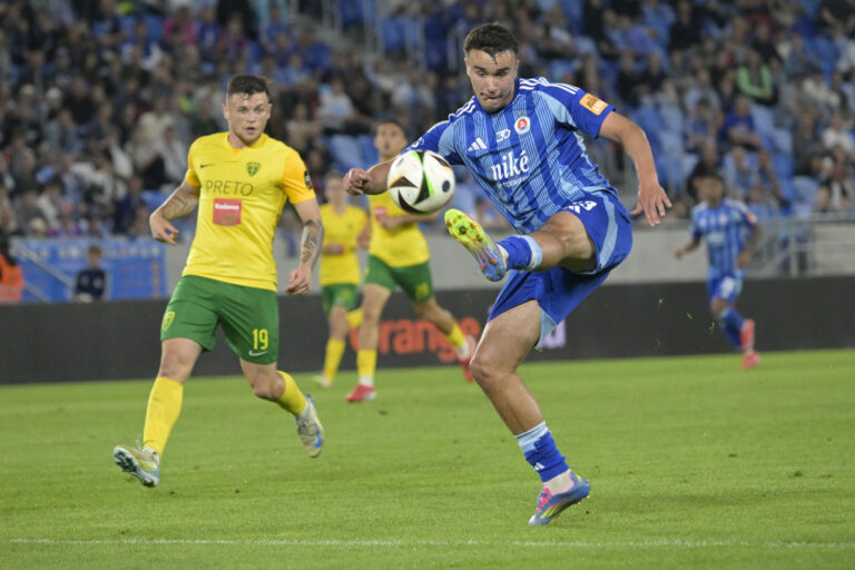 Zľava: Samuel Ďatko z MFK Žilina a David Strelec z ŠK Slovan Bratislava počas futbalového zápasu 8. kola nadstavbovej časti Niké ligy o titul 2024/25 medzi ŠK Slovan Bratislava - MŠK Žilina. Bratislava, 3. máj 2025. Foto: SITA/Milan Illík.