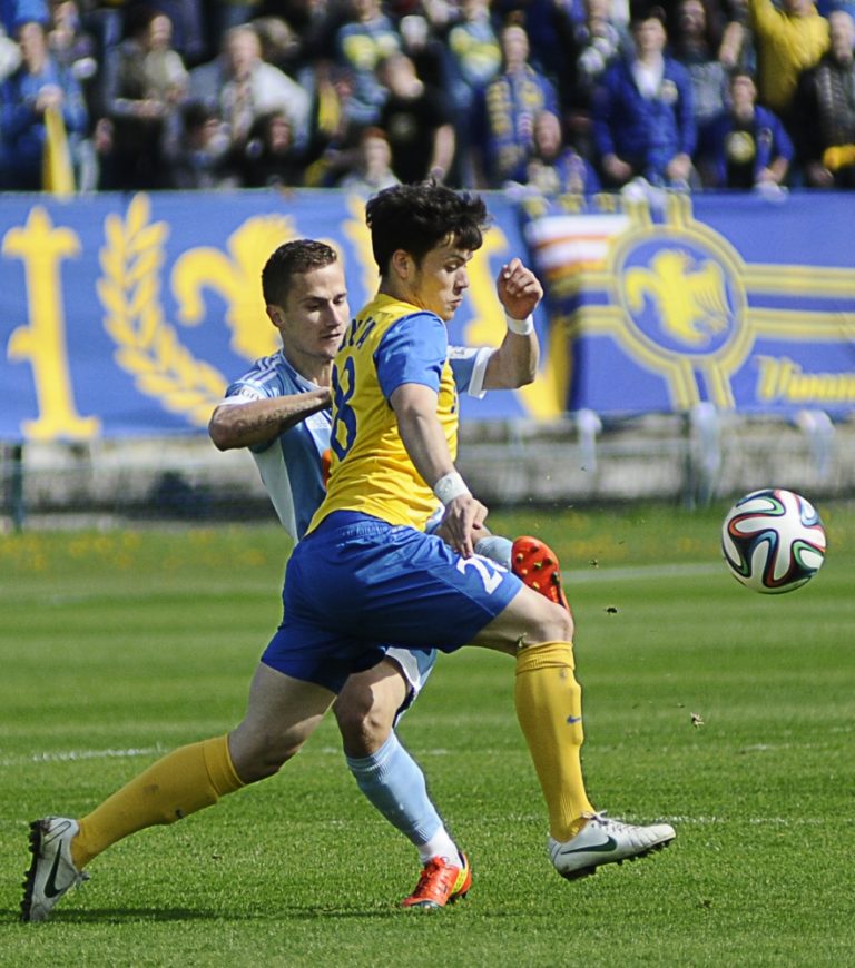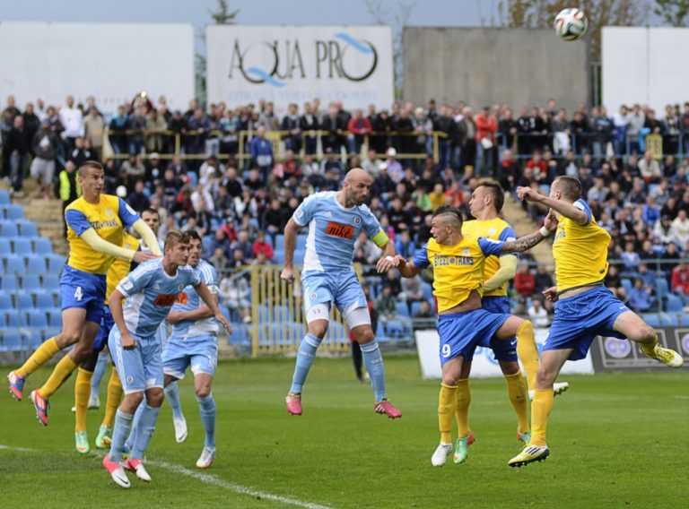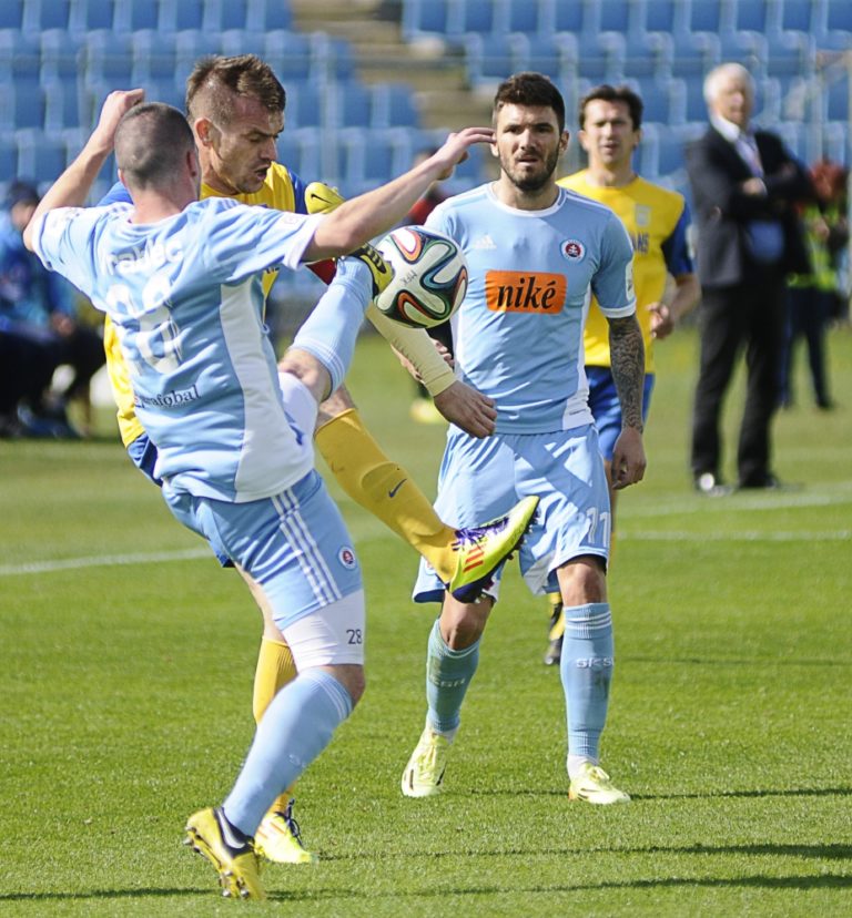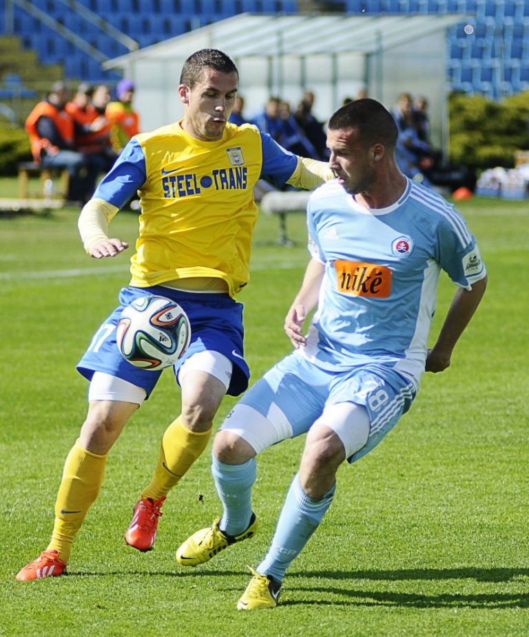 Hráč Košíc Martin Bukata (vpravo) počas zápasu 27. kola Corgoň ligy medzi MFK Košice - Slovan Bratislava. Košice, 19. apríl 2014. Foto: SITA/Jozef Jarošík