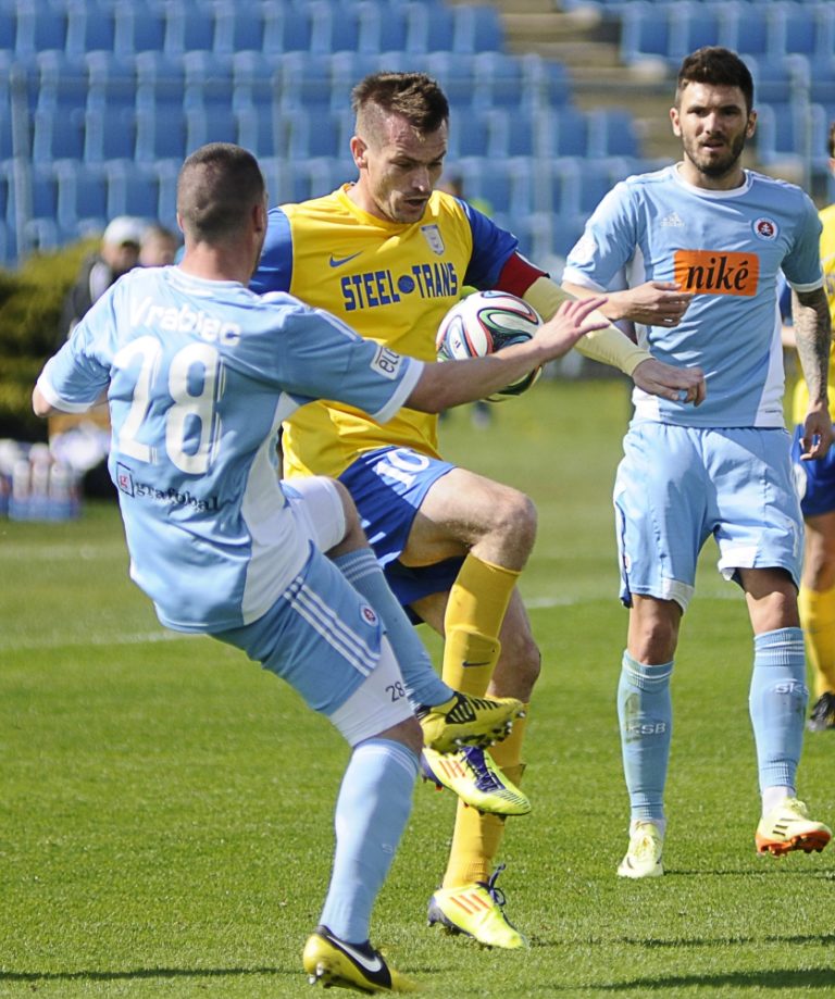 Hráč Bratislavy Róbert Vittek (uprostred) počas zápasu 27. kola Corgoň ligy medzi MFK Košice - Slovan Bratislava. Košice, 19. apríl 2014. Foto: SITA/Jozef Jarošík