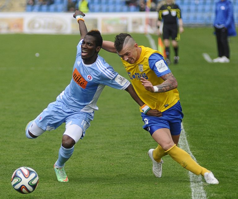 Sprava: Hráč Košíc Erik Pačinda a hráč Bratislavy Lester Stefan Peltier počas zápasu 27. kola Corgoň ligy medzi MFK Košice - Slovan Bratislava. Košice, 19. apríl 2014. Foto: SITA/Jozef Jarošík