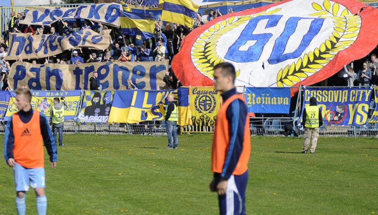 Fanúšikovia Košíc (v pozadí) držiac plachtu pri príležitosti narodenín trénera MFK Košice počas zápasu 27. kola Corgoň ligy medzi MFK Košice - Slovan Bratislava. Košice, 19. apríl 2014. Foto: SITA/Jozef Jarošík