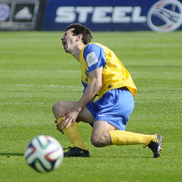 Hráč Košíc Ľubomír Korijkov po zrážke s Peltierom odohral zápas s rozbitou hlavou počas 27. kola Corgoň ligy medzi MFK Košice - Slovan Bratislava. Košice, 19. apríl 2014. Foto: SITA/Jozef Jarošík
