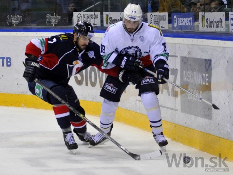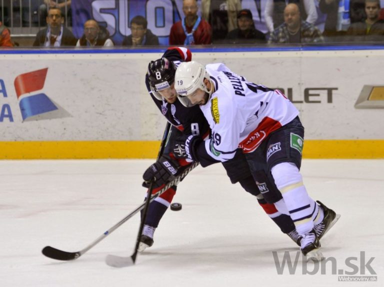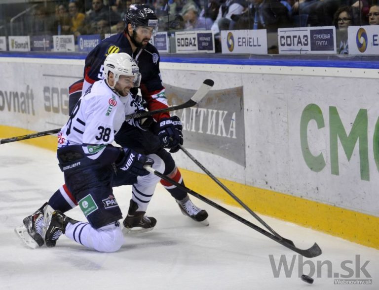 Obranca Slovana Bratislava Ivan Baranka v súboji s útočníkom Medveščaku Záhreb Pascalom Pelletierom počas zápasu Kontinentálnej hokejovej ligy (KHL). Bratislava, 12. novembra. Foto: SITA/Ján Slovák