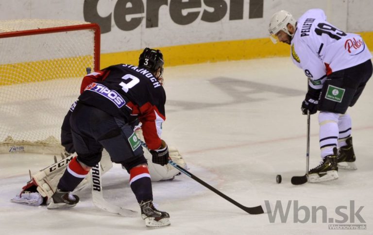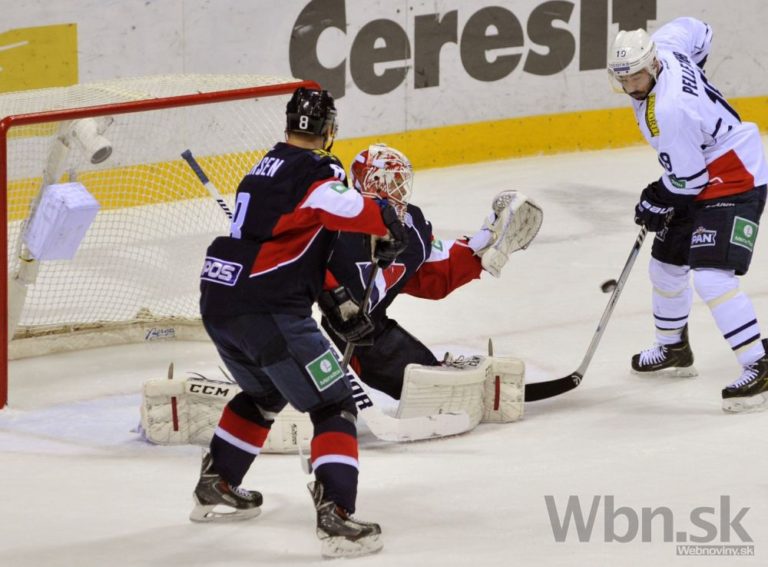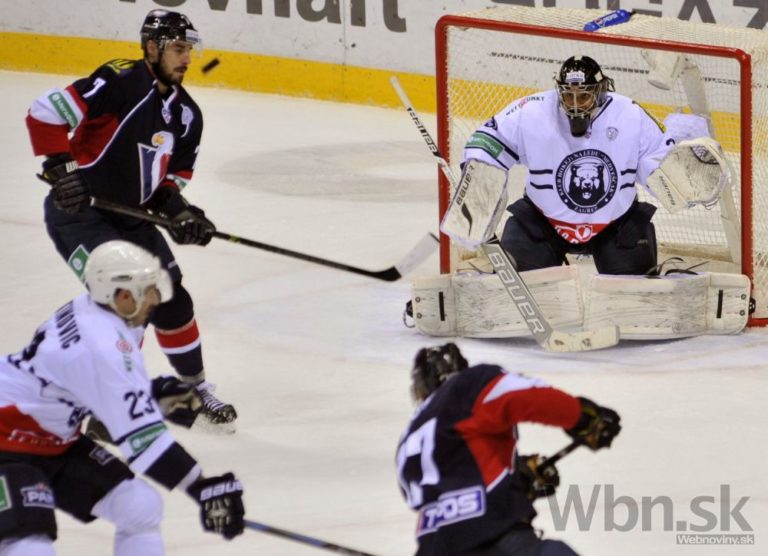 Obranca Slovana Bratislava Michal Sersen sleduje ako brankár Johan Backlund vyráža puk po strele útočníka Medveščaku Záhreb Pascala Pelletiera počas zápasu Kontinentálnej hokejovej ligy (KHL). Bratislava, 12. novembra. Foto: SITA/Ján Slovák