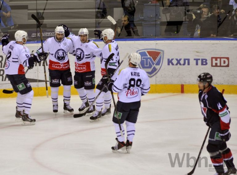 Hráči Medveščaku Záreb sa tešia z gólu v sieti Slovana Bratislava počas zápasu Kontinentálnej hokejovej ligy (KHL). Bratislava, 12. novembra. Foto: SITA/Ján Slovák