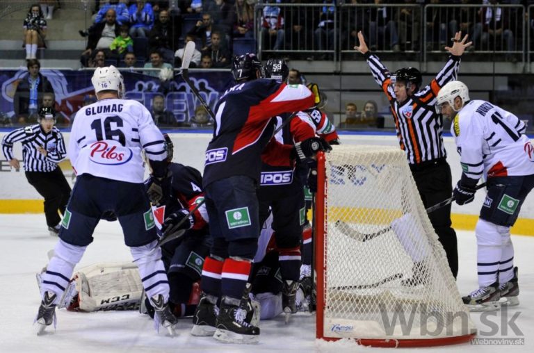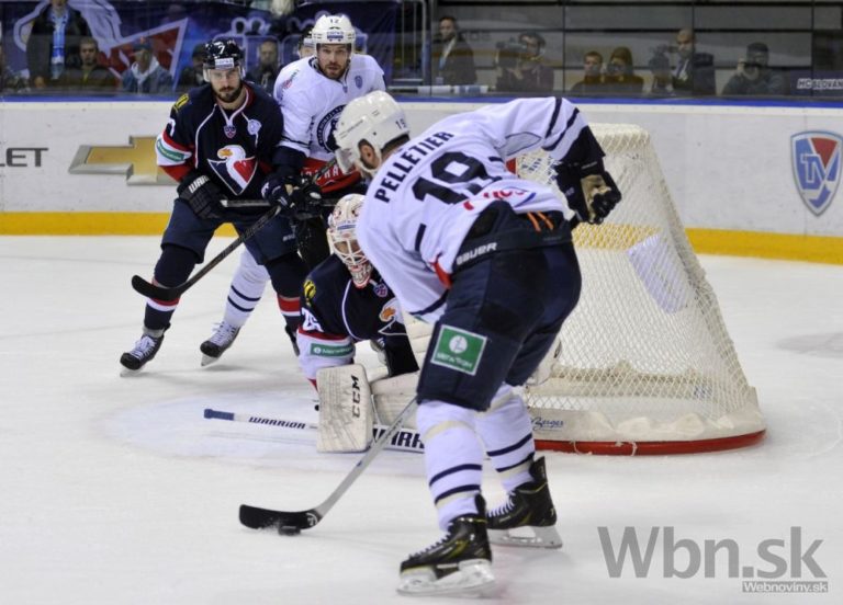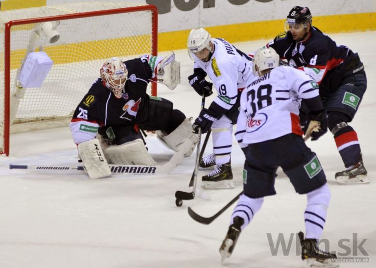 Útočník Medveščaku Záhreb James Wright sa pozerá na súboj svojho spoluhráča Pascala Pelletiera s obrancom Slovanom Bratislava Michalom Sersenom pred brankárom 'belasých' Johanom Backlundom počas zápasu Kontinentálnej hokejovej ligy (KHL). Bratislava, 12. novembra. Foto: SITA/Ján Slovák