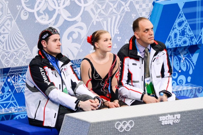 Zľava: Tréner Igor Krokavec, slovenská reprezentantka v krasokorčuľovaní Nicole Rajičová a otec Nicole Rajičovej Tomislav počas voľných jázd žien na ZOH 2014 v Soči. Rusko, Soči, 20. február 2014. Foto: SITA/Jozef Jakubčo