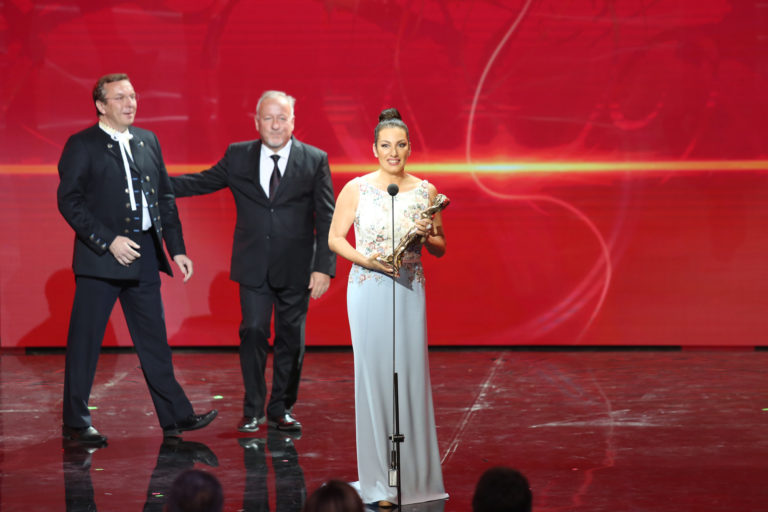 Víťazka kategórie Absolútna Slovenka roka 2018 a váťazka kategórie Charita Katarína Šimovičová počas vyhlasovania výsledkov 10. ročníka čitateľskej ankety Slovenka roka 2018 v historickej budove Slovenského národného divadla. Bratislava, 5. jún 2018. Foto: SITA/Slovenka roka/Ramon Leško.