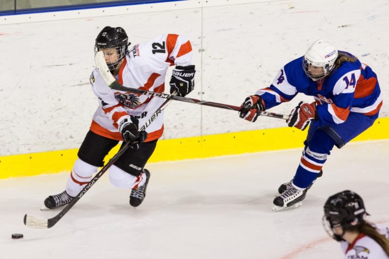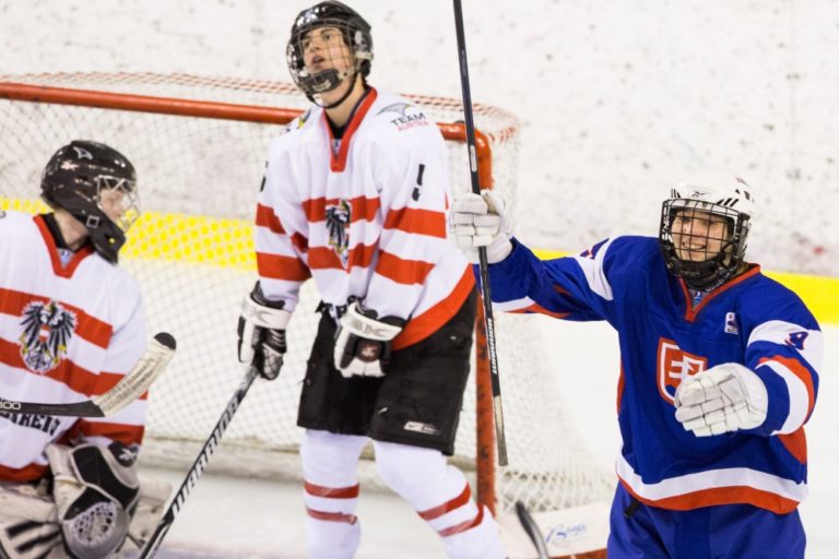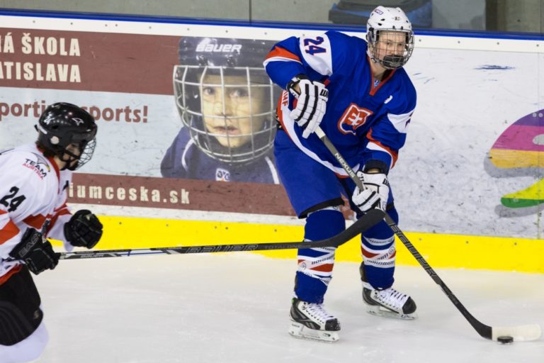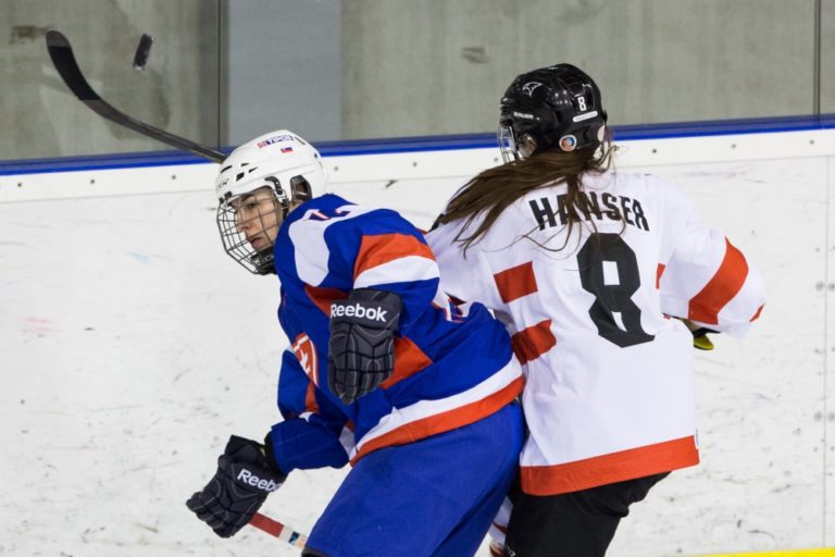Hráčka Slovenska Lenka Krajňáková (vpravo) počas medzištátneho prípravného hokejového zápasu žien Slovensko - Rakúsko. Bratislava, 29. marec 2014. Foto: SITA/Jozef Jakubčo